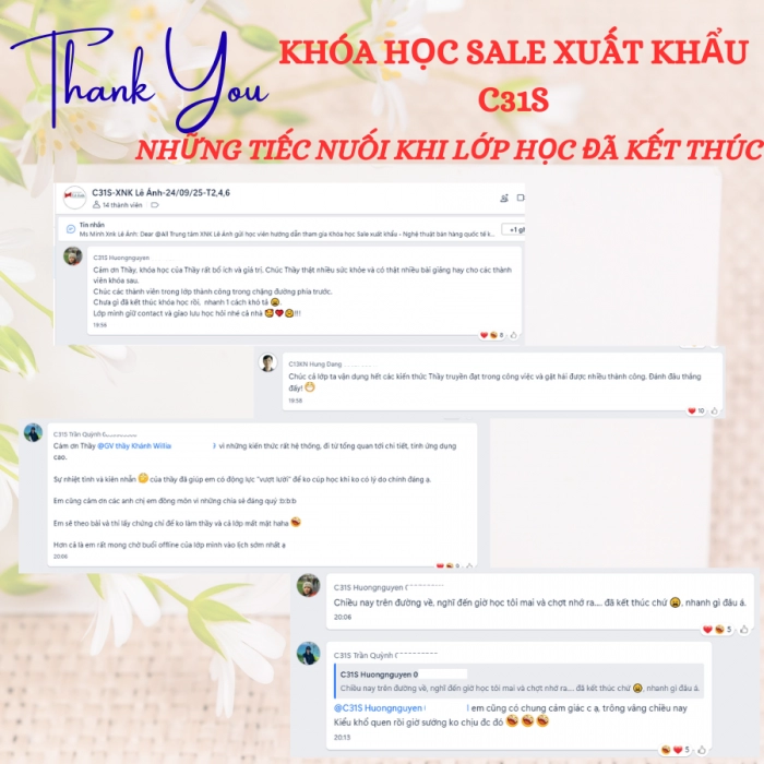 e đã học hỏi thêm được nhiều cách hay để tìm kiểm khách hàng hơn, rất cảm ơn khóa học sales xuất khẩu của trung tâm ạ