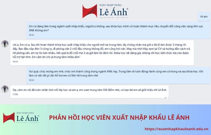 ✔ Tự tin khi đi ứng tuyển tại các doanh nghiệp xuất nhập khẩu - Logistics. Ngoài kiến thức chuyên môn và kỹ năng nghiệp vụ, XNK Lê Ánh cũng rất chú trọng vào việc chia sẻ cho học viên kinh nghiệm khi đi phỏng vấn tuyển dụng, viết CV, làm các bài thi tuyển đầu vào, kỹ năng mềm cần có với 1 nhân viên mới trong công ty xuất nhập khẩu.